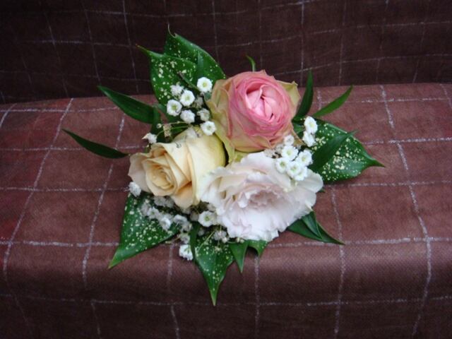 淡い縁取りピンクばら、クリーム色ばら、白トルコ、カスミ草、イタリアンルスカス、ゴットえを使用。パステル系で、柔らかい作品に仕上がっています。
