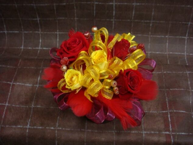 赤バラの中に黄色のバラとリボンが入っています。華やかなアレンジにしあがっています。男女問わずプレゼントに最適です。