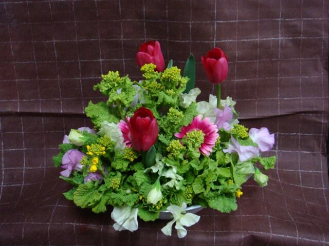 春を象徴する花である菜の花やチューリップを使ったアレンジです。春らしい爽やかさと可愛らしさがあります。贈り物としてオススメです。