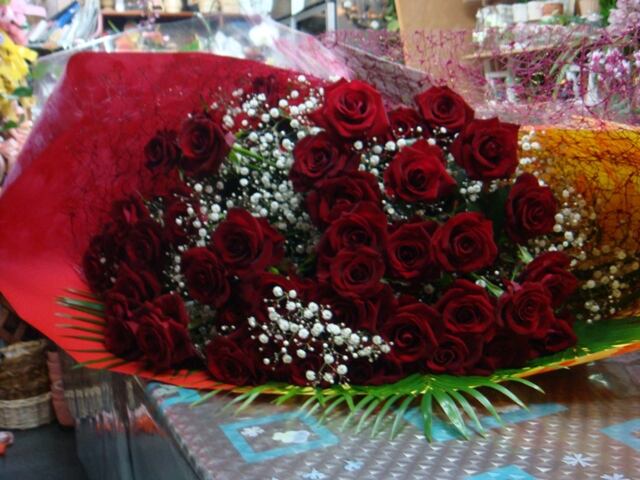 定番の花束。赤バラとかすみ草の豪華な花束です。男性から女性に贈るプレゼントに人気商品少し高価ですがプレゼント、贈り物に最適です。